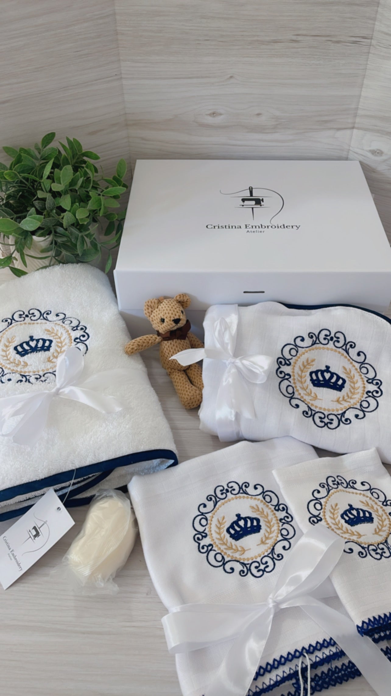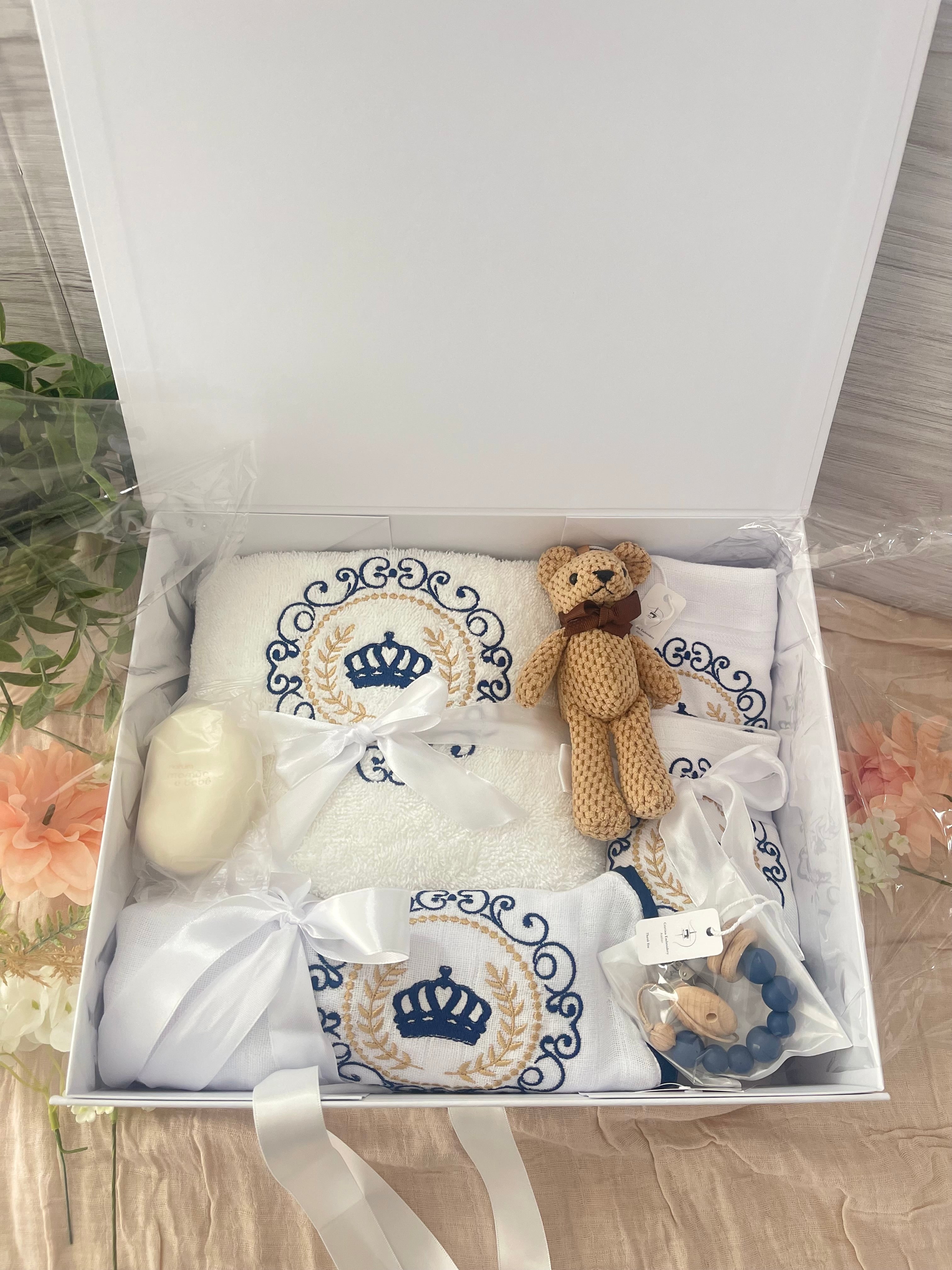 Embroidered Baby Gift Box – Handcrafted Hamper with 7 Essentials - Navy Blue Crown Frame$258.90$278.90