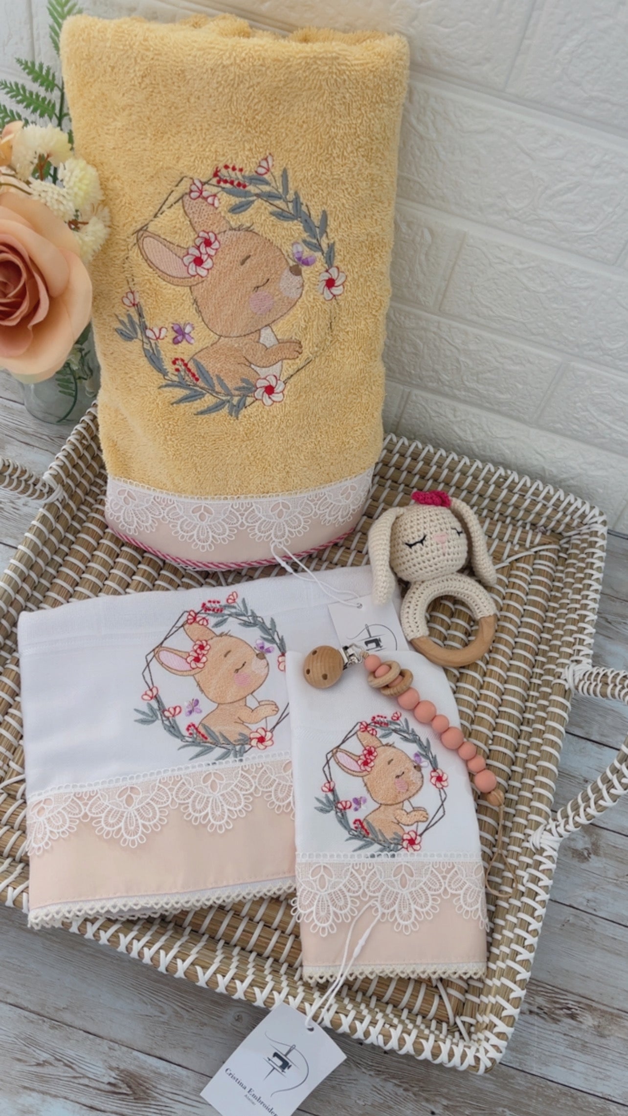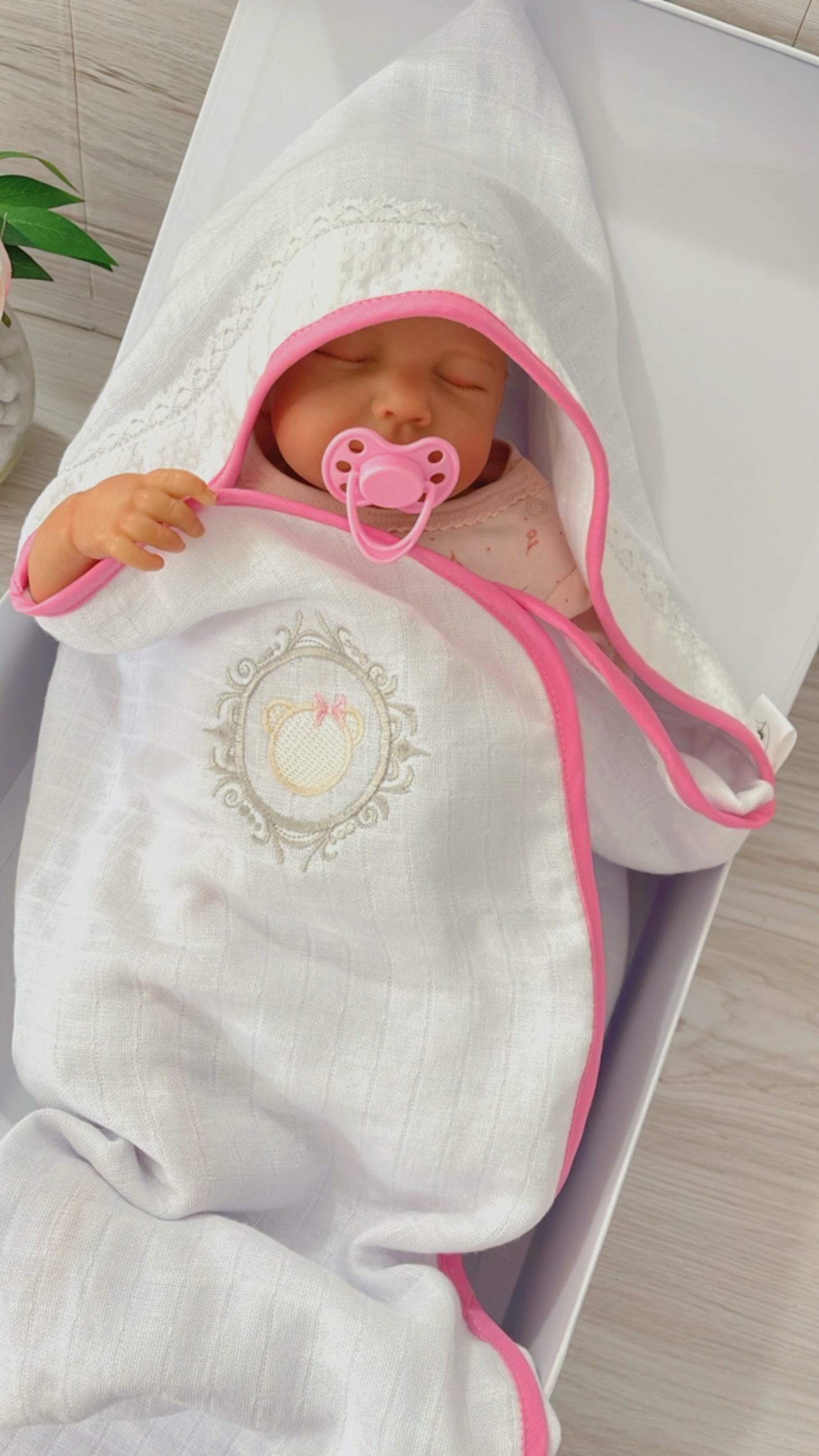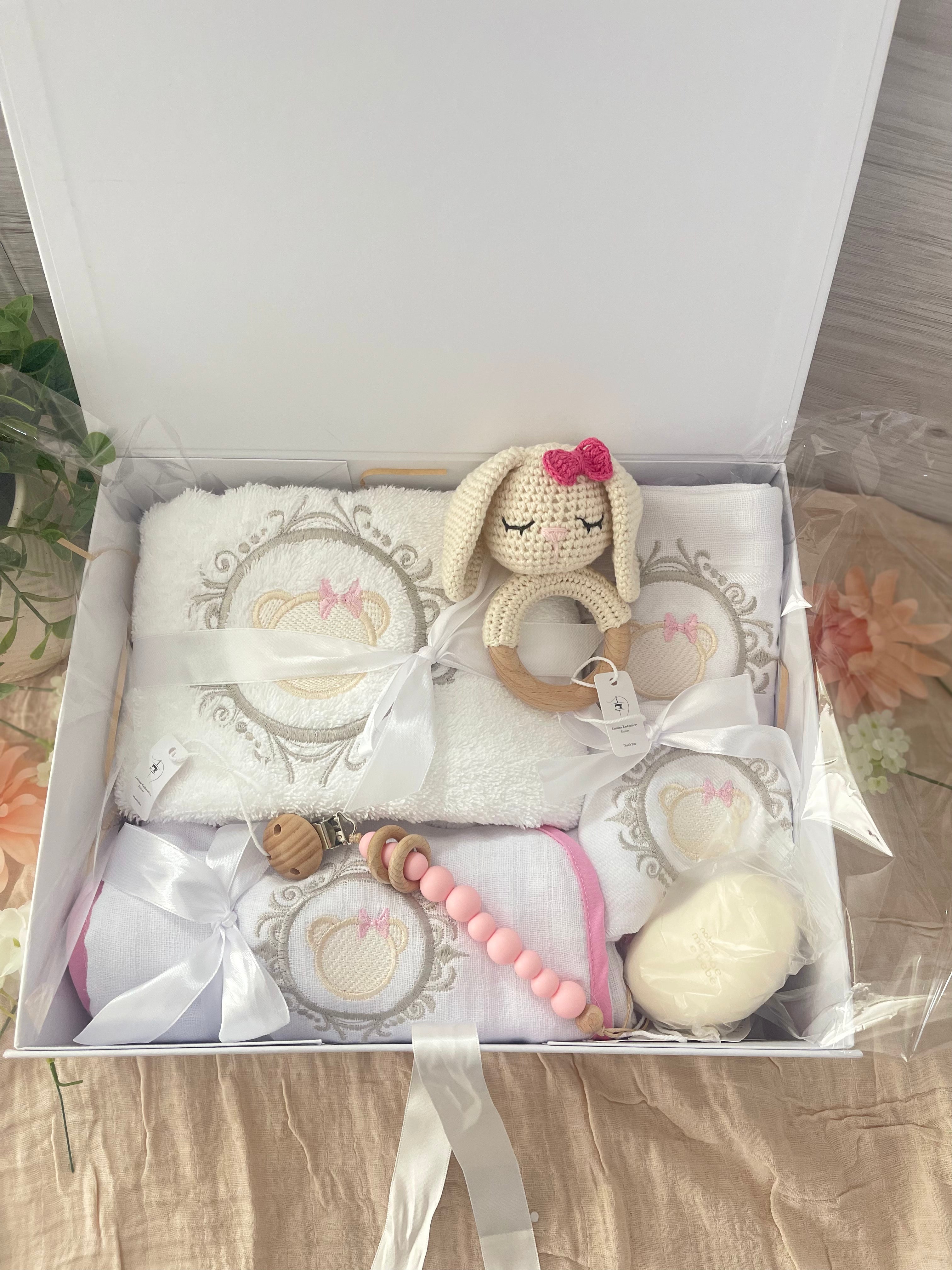 Embroidered Baby Girl Gift Box – Handcrafted Hamper with 7 Essentials - Frame Head Teddy Bear$258.90$278.90